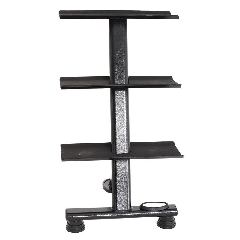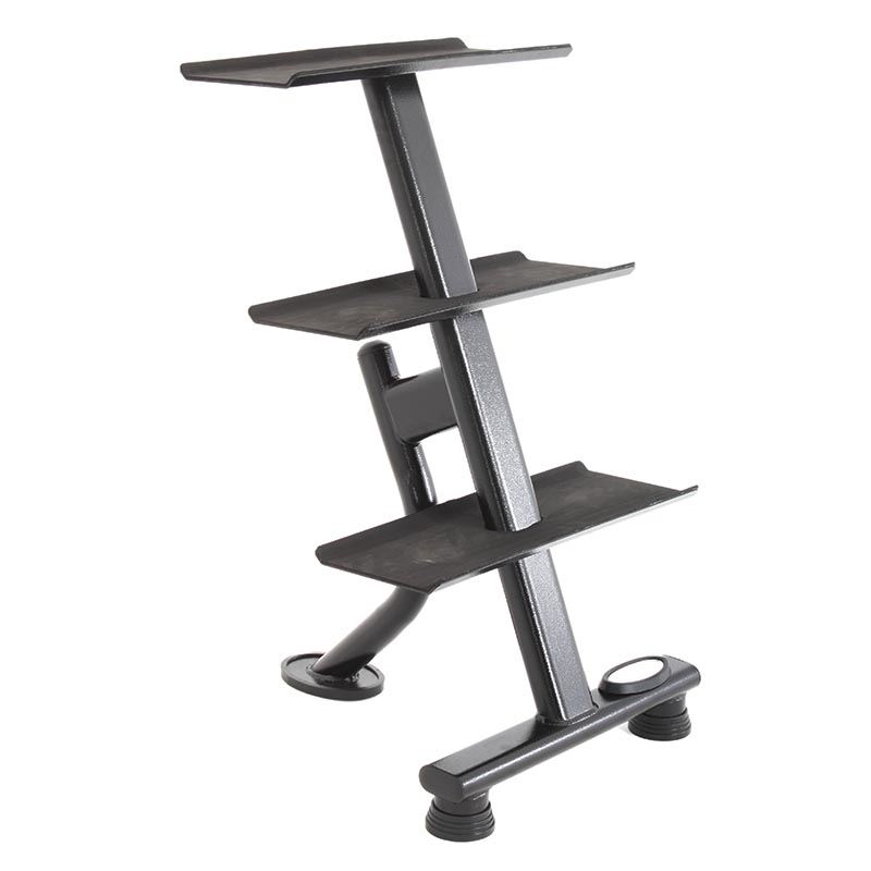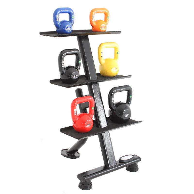Estrutura em tubo de aço carbono oblongo com 03mm de espessura, pintura eletrostática a proteção, pés com sapatilhas emborrachadas aprimoradas, possui três prateleiras com capacidade para armazenar 03 pares de kettlebells, base da grade com acabamento em borracha para evitar danos ao produto.