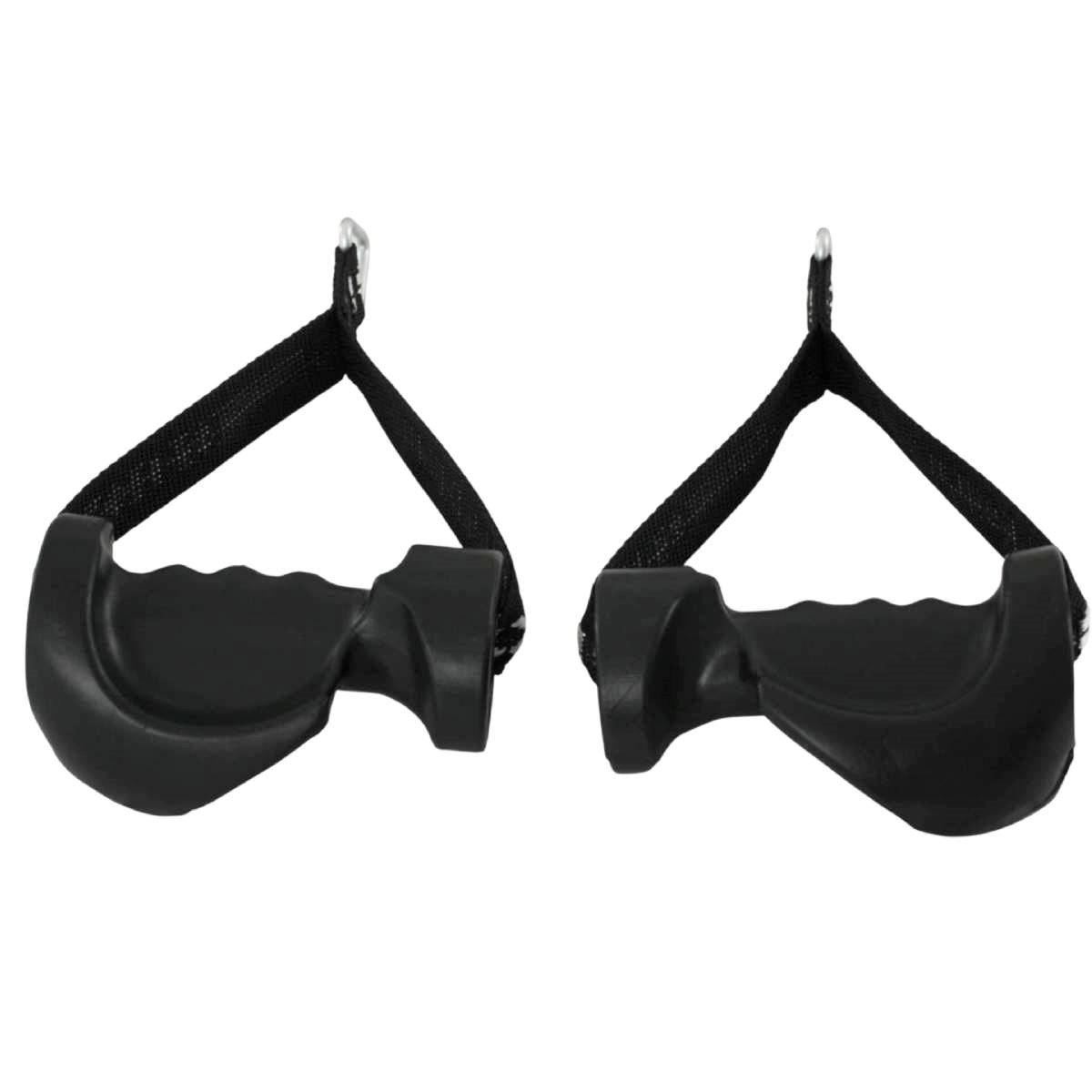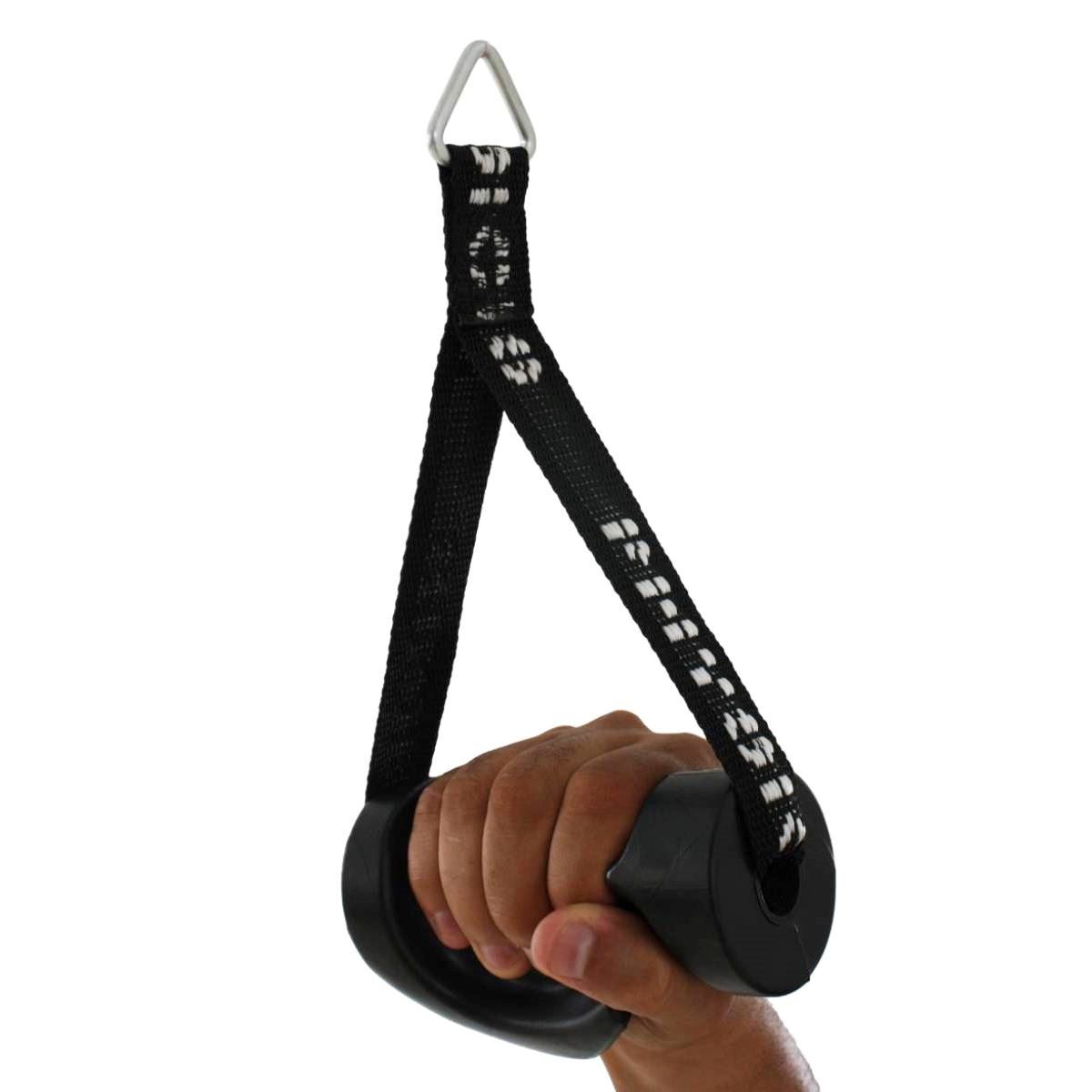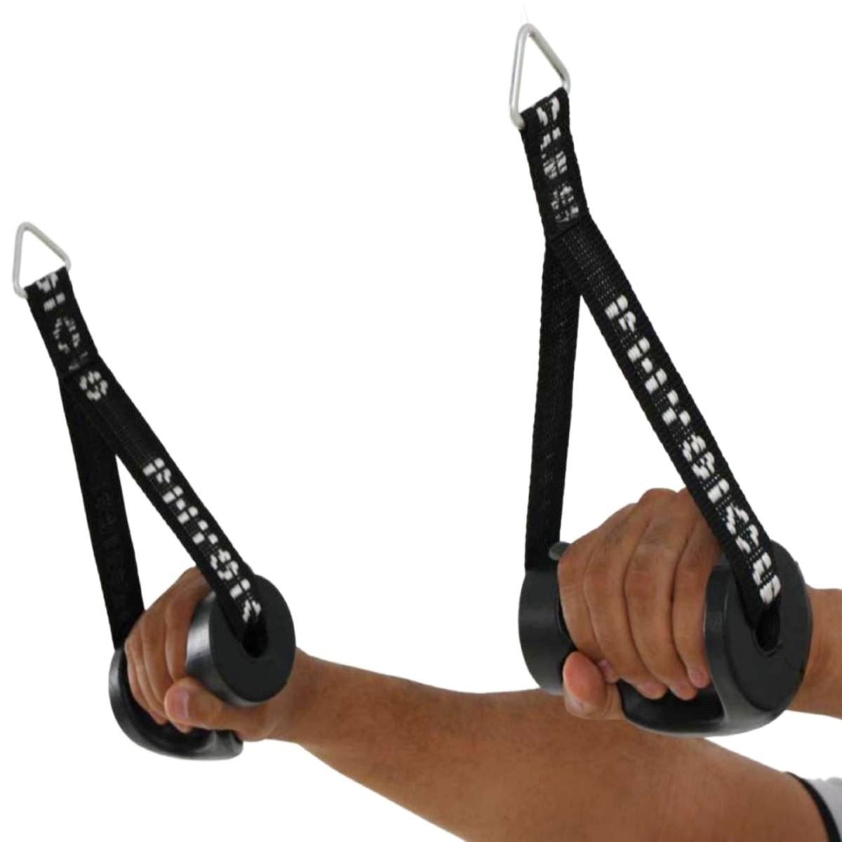 APLICAÇÃO.: Acessório para operações de membros superiores quanto à órbita de equipamentos com bateria de pesos, especialmente polias tais como Cross Over ou Torres Unilaterais. CARACTERÍSTICAS TÉCNICAS.: Fabricado em material sintético de alta resistência, produzido em manoplas injetadas em borracha com acabamento anatômico, possui dispositivo para acoplar ao cabo do equipamento.